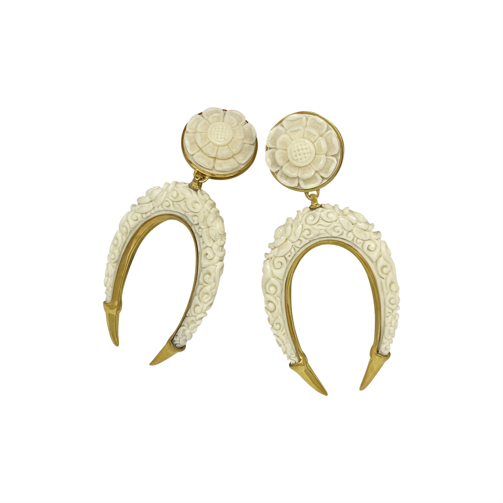 The Saras earrings are our best selling iconic earrings, hand carved sacred bone and set silver gold plated. A contemporary design celebrating tribal ancestry and traditional carvings found on Balinese holy temples. Available to pre-order in solid gold- to learn more contact us directly.